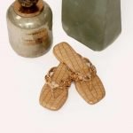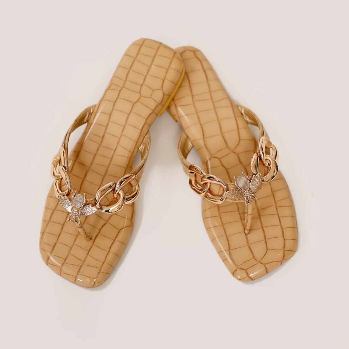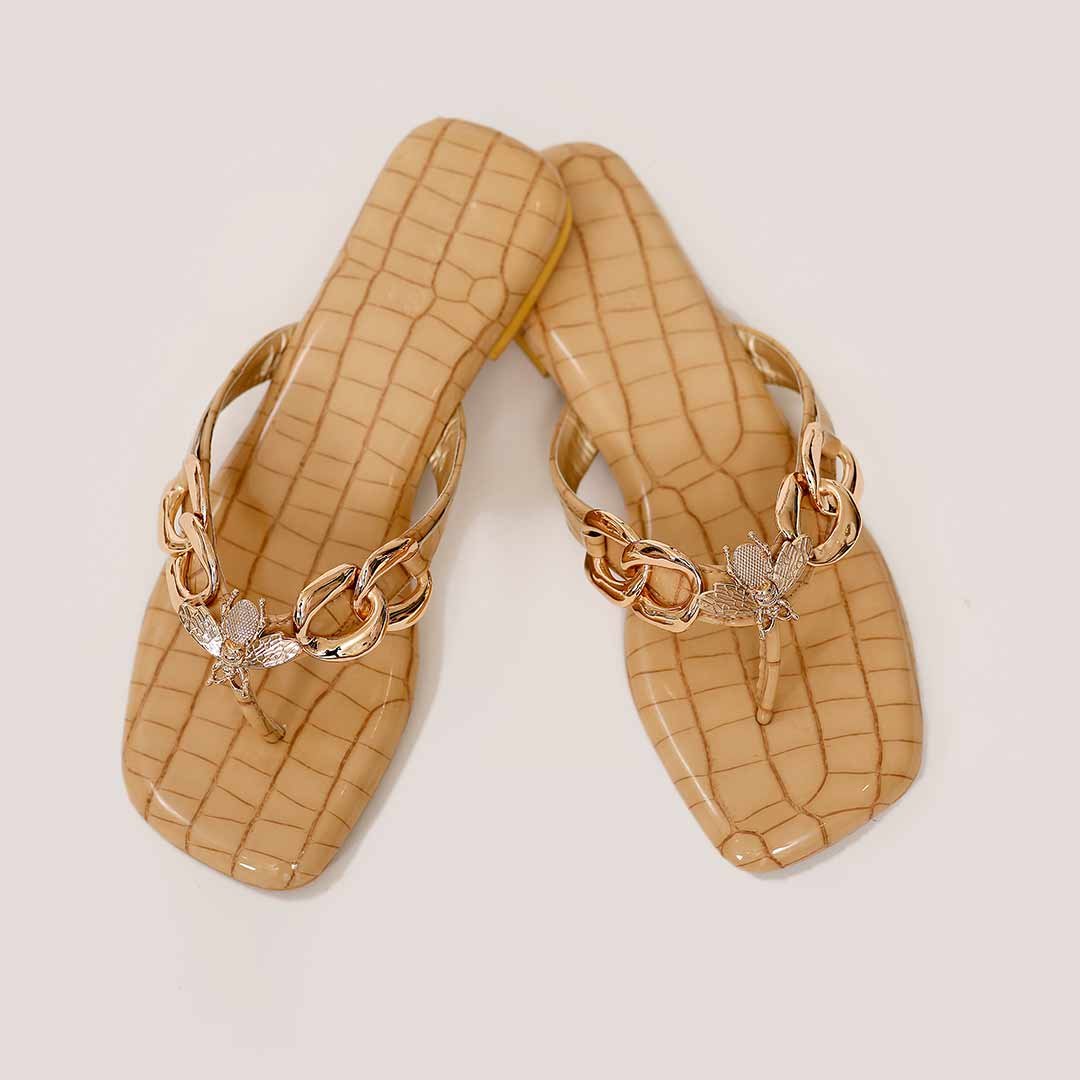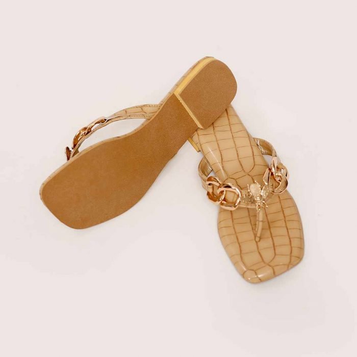 Textured patent sandals set on a square patterned sole embellished with metal chains and a bee.