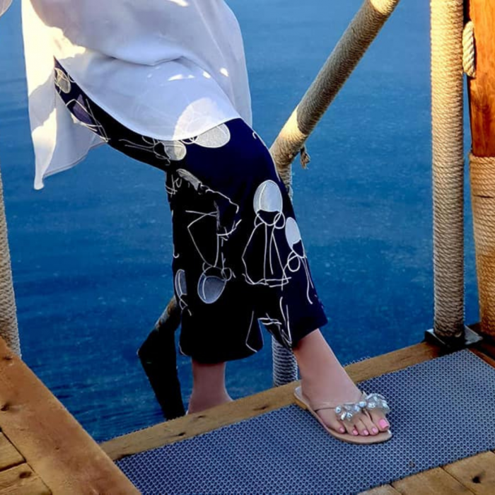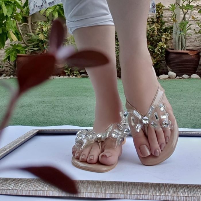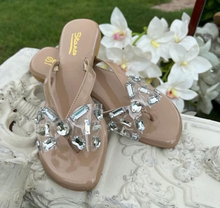 The perfect skin colored flip flop sandals embellished with a studded transparent bow. Now that’s what we call subtle exaggeration!